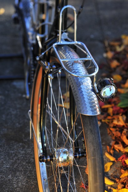 I’m quite pleased with how it turned out. Vinny wanted to try fat 650B wheels, but his tastes run more toward the new-wave so we decided on a sloping top tube and a stiff frame made from large diameter tubes. There’s a USB charging port on top of the stem which is powered by the dynamo hub, and it has S&S couplers so he can travel with it more easily. I think it’s a very successful blend of traditional and modern, taking the most functional aspects from yesteryear and pairing them with the best of today.