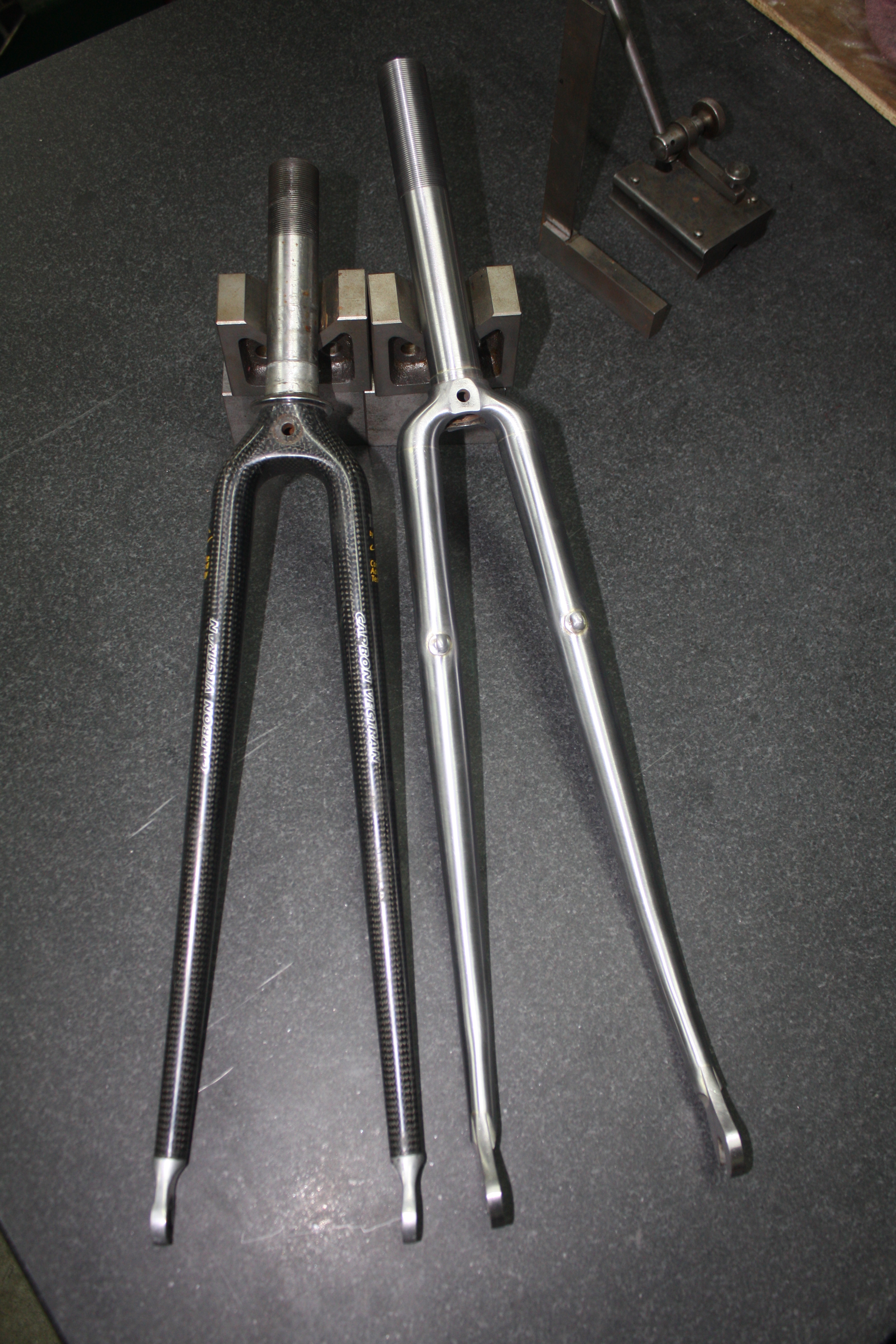 My friend John has a nice Eddy Merckx titanium bike. It was built by Litespeed if I remember correctly. It’s a really fancy bike, but it’s seen a lot of miles and needs a bit of a makeover. One of the things John was concerned about was the longevity of the original fork. The item in question was made by Time out of carbon fiber, sometime in the early to mid 1990s. It was without a doubt top-of-the-line and quite expensive when it was new. That was almost twenty years ago though and it’s a bit dated at this point.