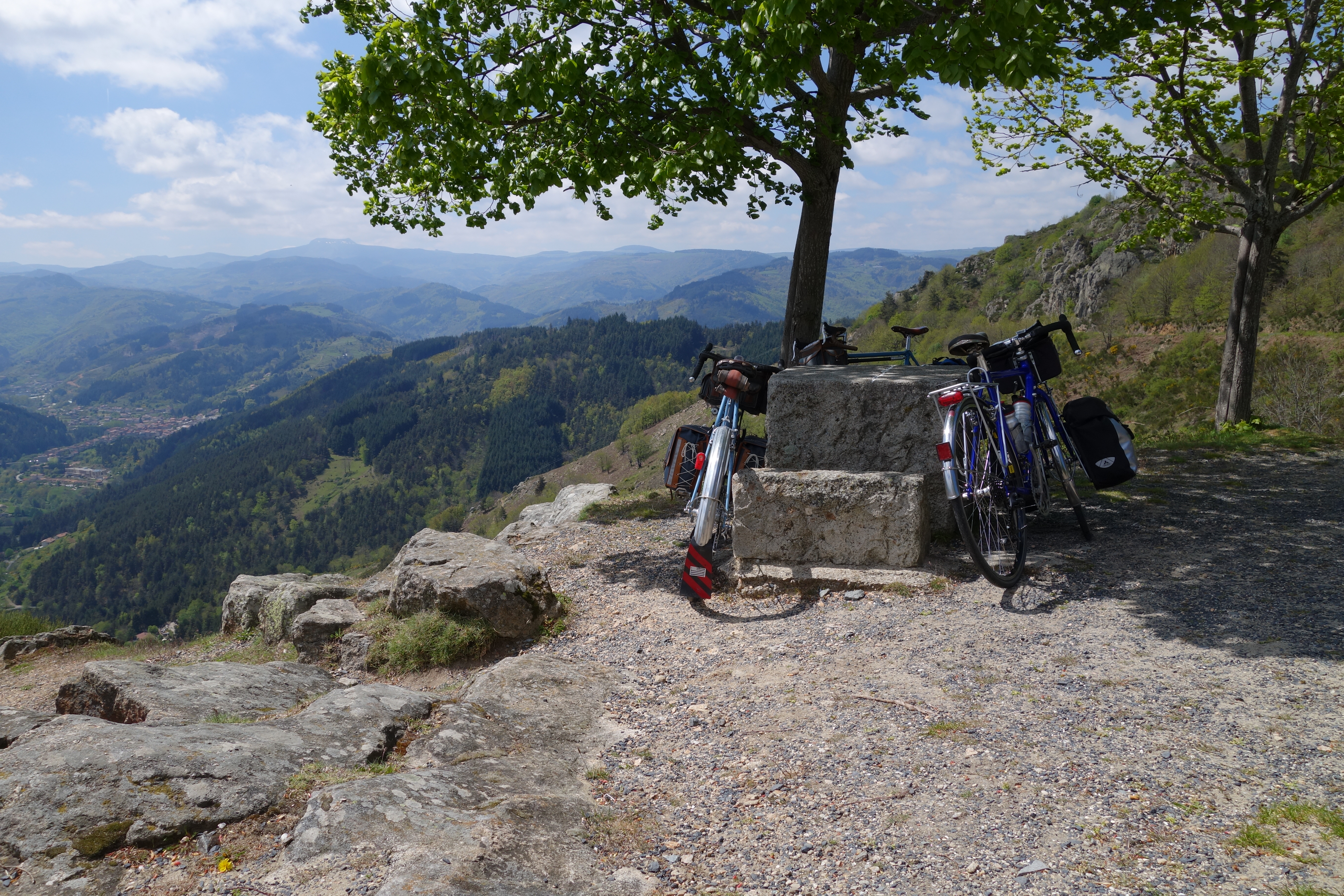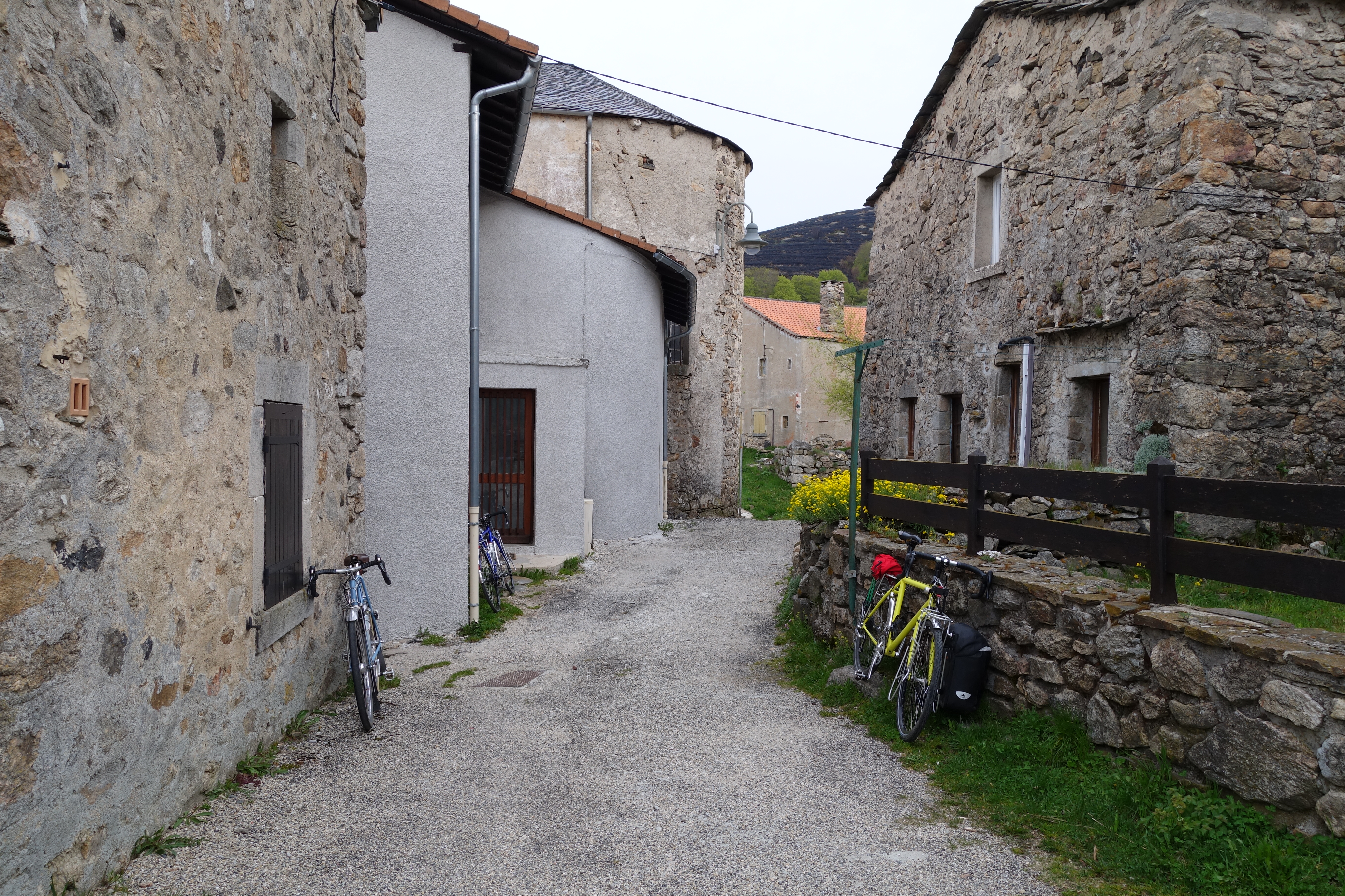 Our bikes at a lovely pull-out spot overlooking the ruins of the Chateau de Rochebonne.A chilly morning on the second day, leaving the town of Dornas. Proof that 650B, 26″, and 700C can peacefully coexist!A busy street outside our home for the night, in the village of Loubaresse.My bike resting after climbing up the valley wall from the river. Gorges de l’Ardèche.Gorges de l’Ardèche. I think this is the only rain we had all week.Random shot of me, somewhere near the end of the trip, cresting ANOTHER hill!