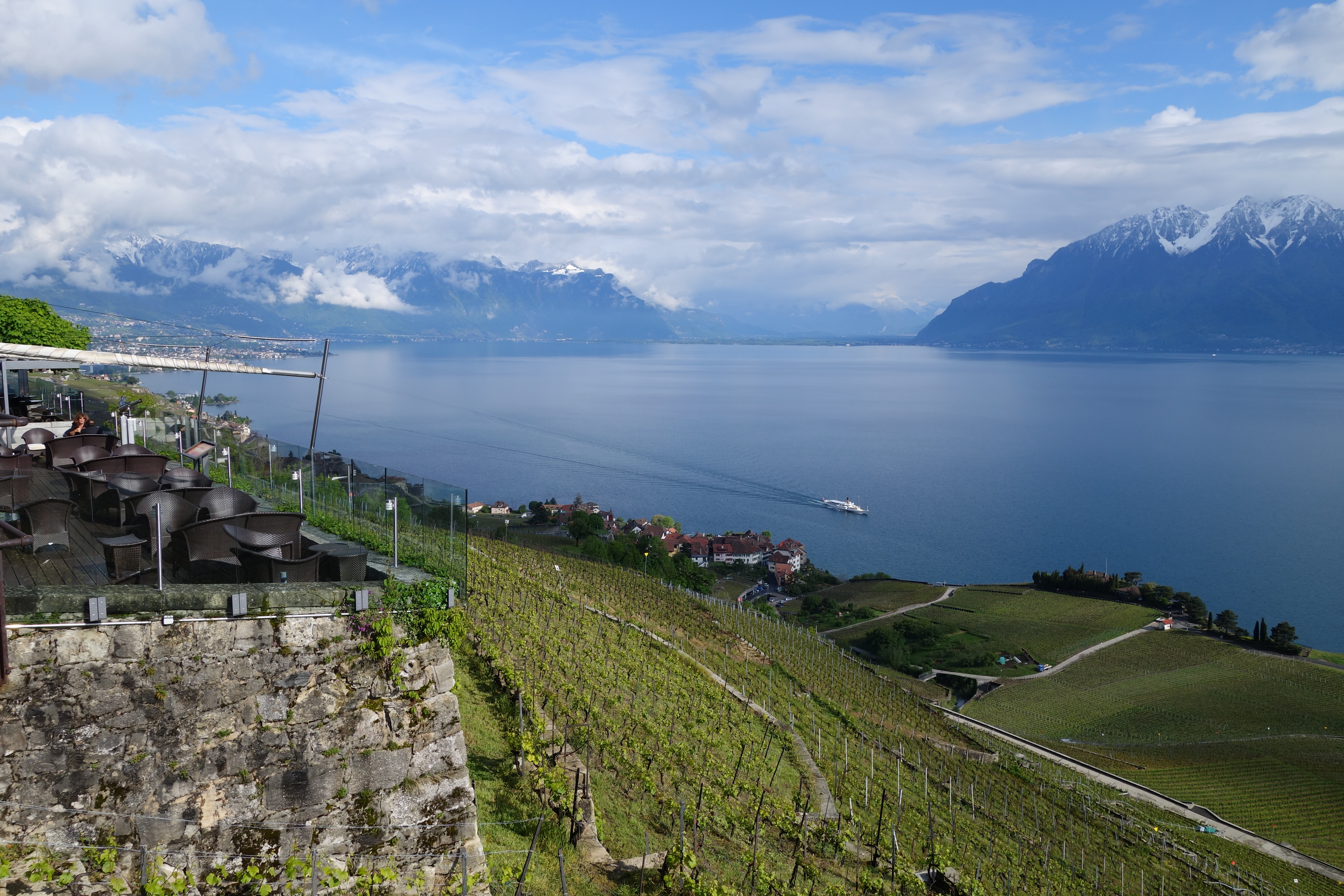 It was a short and pleasant ride across the lake to Switzerland. I first met Luc and Val a little over a year ago when they were riding their bicycles around the world and they invited me to visit them at home if I was ever in the region. They are wonderful photographers and you can see photos from their journey here. Their blog is here and it’s worth clicking on even if you don’t read French. Before the boat even docked I was able to recognize the two cyclists waiting in the crowd . They gave me a quick tour of Lausanne and then we rode through the vineyards toward La-Tour-de-Peilz.